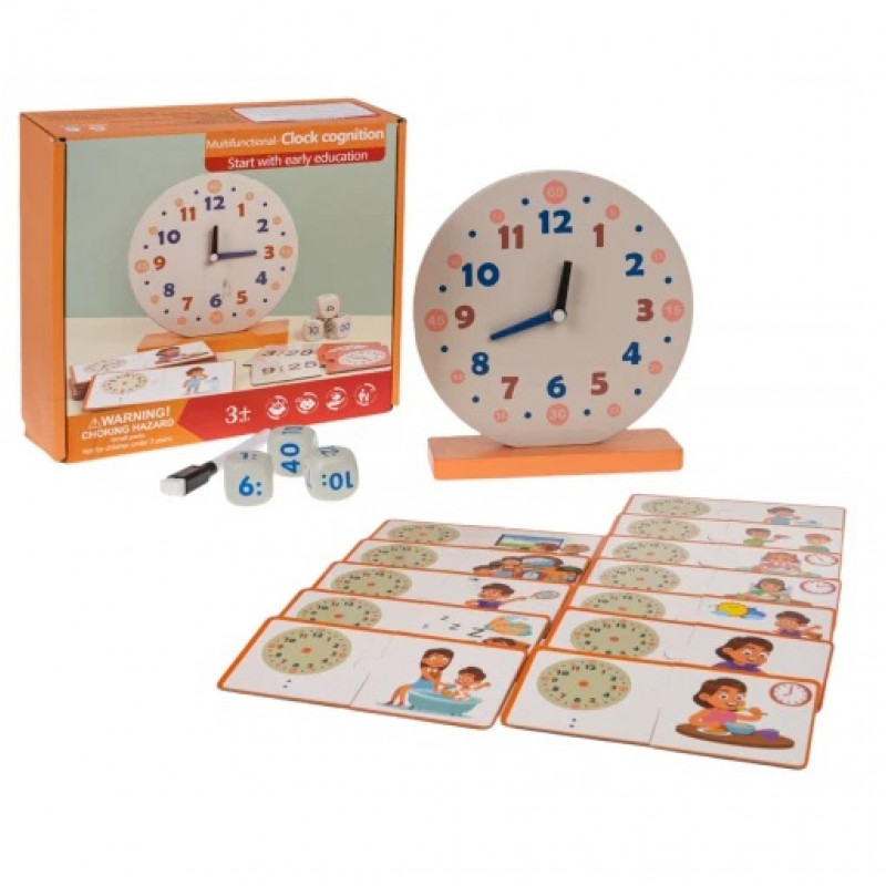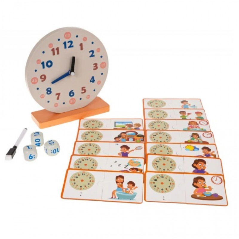 Дитина може рухати стрілки годинника, кидати кубики та встановлювати години, а також вчитися, зіставляючи відповідні частини головоломки. У набір також входить маркер, завдяки якому ви можете позначати конкретні години на двосторонніх картках активності.