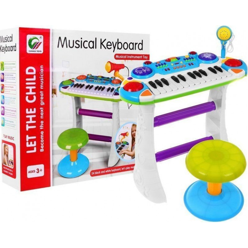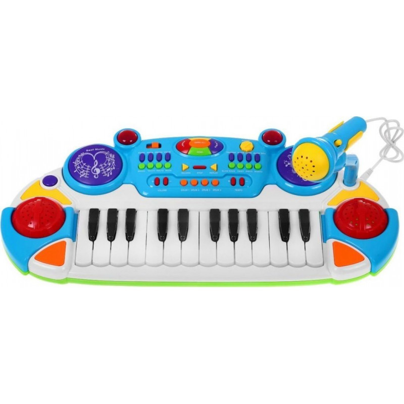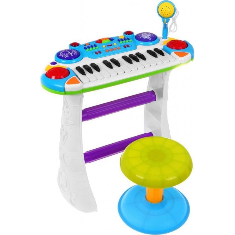 На столику з клавіатурою діти також отримують мікрофон на підставці для співу та багато інтерактивних функцій. Музична клавіатура складається з 24 білих і чорних клавіш , тобто 2 октави. З боків 2 динаміки хорошої якості .