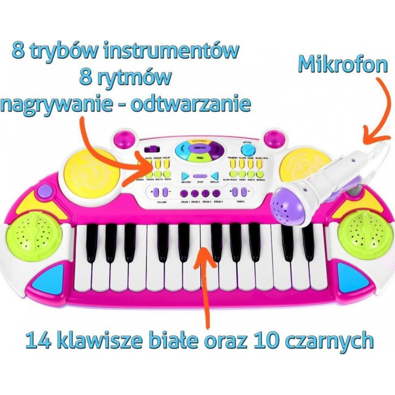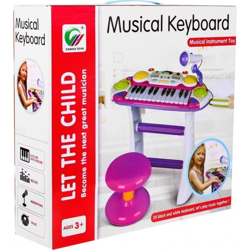 На столику з клавіатурою діти також отримують мікрофон на підставці для співу та багато інтерактивних функцій. Музична клавіатура складається з 24 білих і чорних клавіш , тобто 2 октави. З боків 2 динаміки хорошої якості .