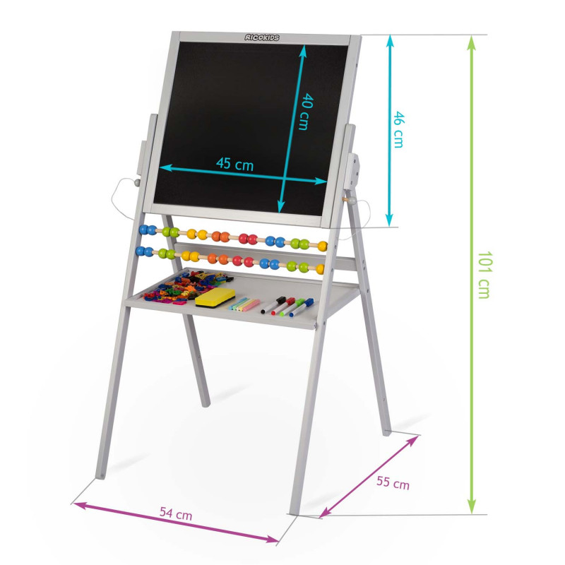 Подаруйте своїй дитині особливу радість. Велика і стійка дитяча дошка для малювання від Ricokids - це дитяча мрія, що здійснилася.У наборі є все необхідне для навчання та ігор.
