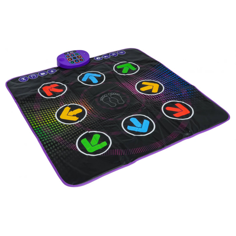 Чорна танцювальна килимок - це пропозиція для дітей, які люблять рух, звуки і кольорові світлові ефекти. Створений для дітей від 3 років, він заохочує до фізичної активності в привабливій формі. Неслизька основа забезпечує безпеку під час гри, а м'яка, кольорова поверхня приємна на дотик і зручна у використанні.