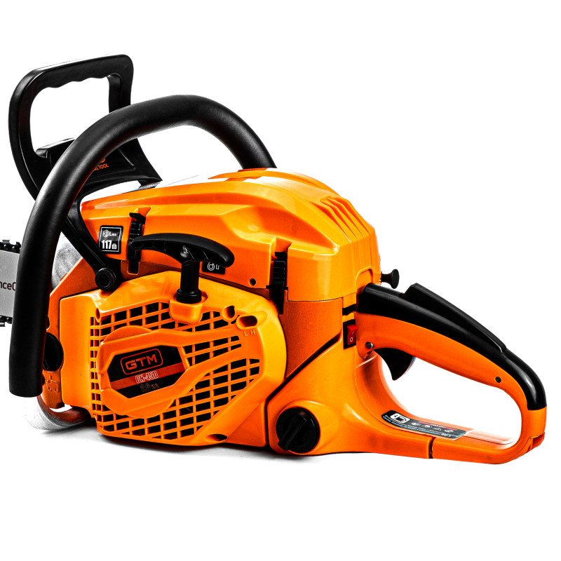 GTM CN58D - високопродуктивна бензопила професійного класу, призначена для середніх та великих навантажень під час спилювання дерев, обрізання саду, заготівлі дров. Інструмент обладнаний 2-тактним бензиновим двигуном з потужністю 2,4 кВт (3,3 к.с.) з підвищеним крутним моментом і збільшеним ресурсом роботи. Як паливо використовується суміш бензину з моторним мастилом у пропорції 40:1 (на 1 л бензину 25 мл мастила).
