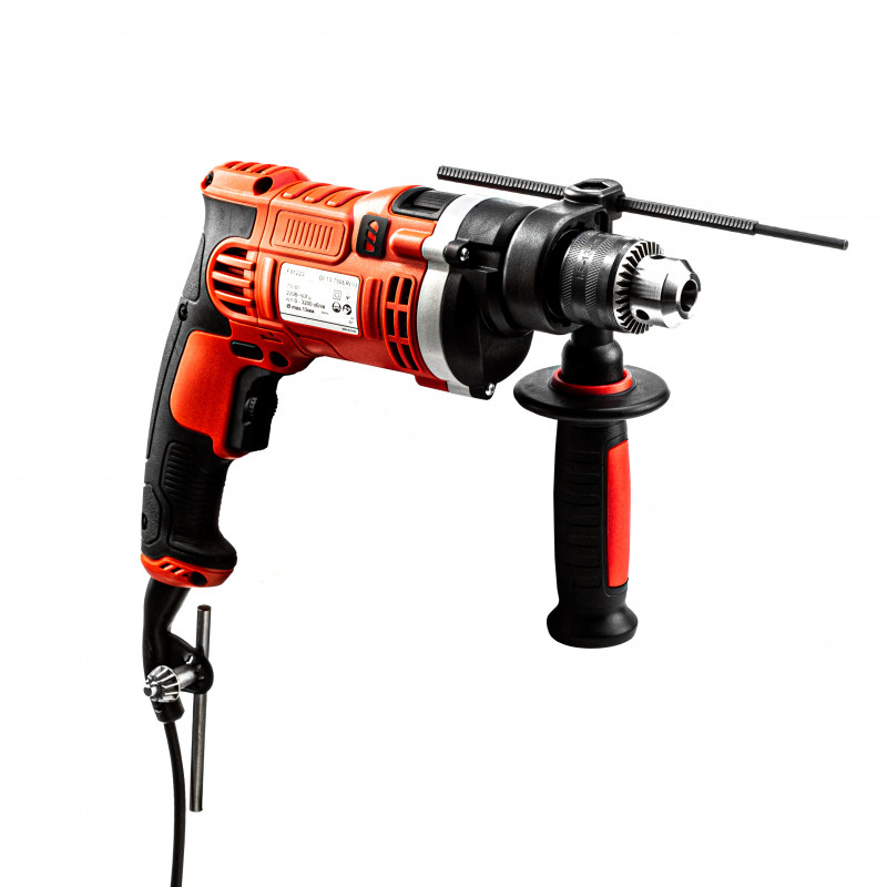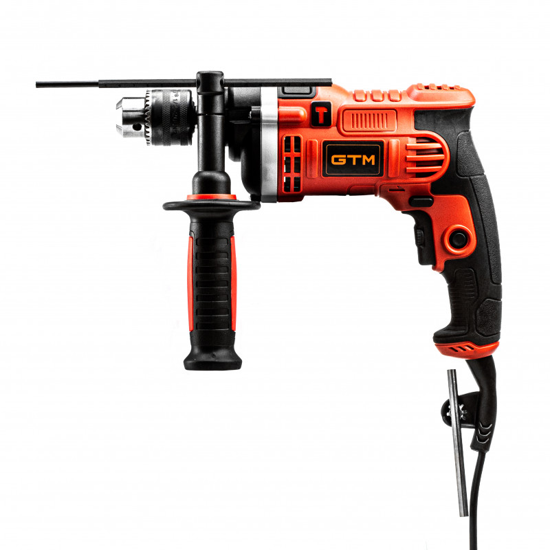 Ударний дриль GTM DI-13/750ER(M) комплектується ключовим патроном для свердел, обмежувачем глибини свердління і додатковою рукояткою.