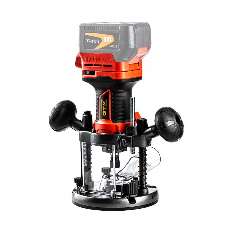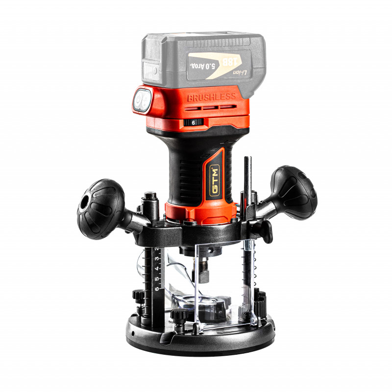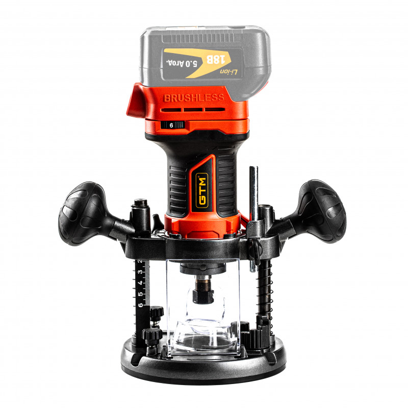 GTM R18/55BL - потужний інструмент при виконанні численних робіт з обробки дерева, з живленням від стандартних акумуляторів GTM 18V. Конструкція даної моделі дозволяє використовувати його як вертикальний, так і кромочний тип фрезера. У фрезер вбудований продуктивний безщітковий двигун, який набагато ефективніше витрачає заряд акумулятора. Регульована цанга дає можливість застосовувати фрези з хвостовиком 6 мм і 8 мм.