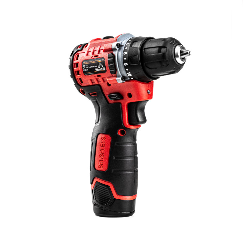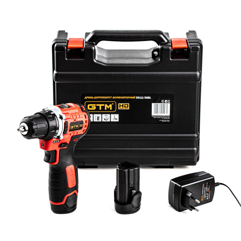 GTM DS12/38BL - компактний дриль-шурупокрут професійного класу з живленням від Li-Ion акумуляторів напругою 12 В. У шурупокруті встановлений швидкозатискний 10 мм патрон для роботи з бітами і свердлами. Двигун у цій моделі безщітковий, що значно зменшує розміри корпусу і вагу. Редуктор двоступеневий і дає змогу регулювати максимальну швидкість залежно від завдання. У даній моделі присутні 20 режимів для закручування кріплень, з максимальним крутним моментом 38 Н*м, а також режим свердління.