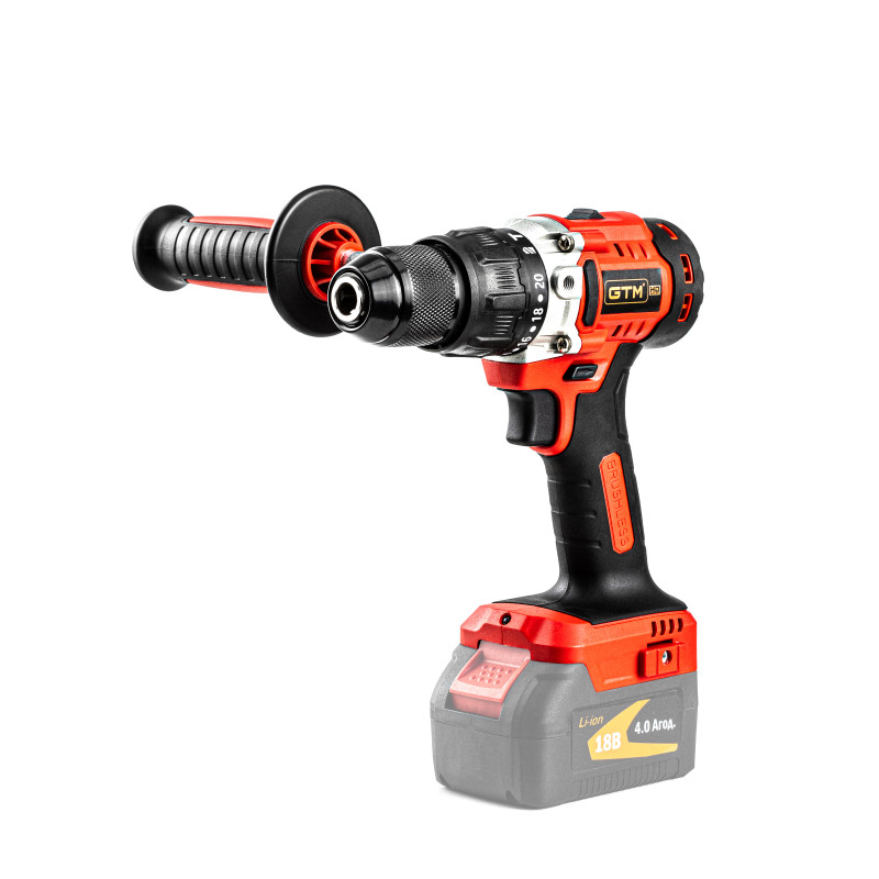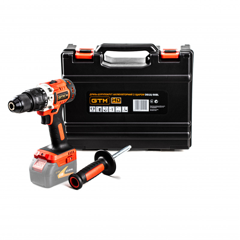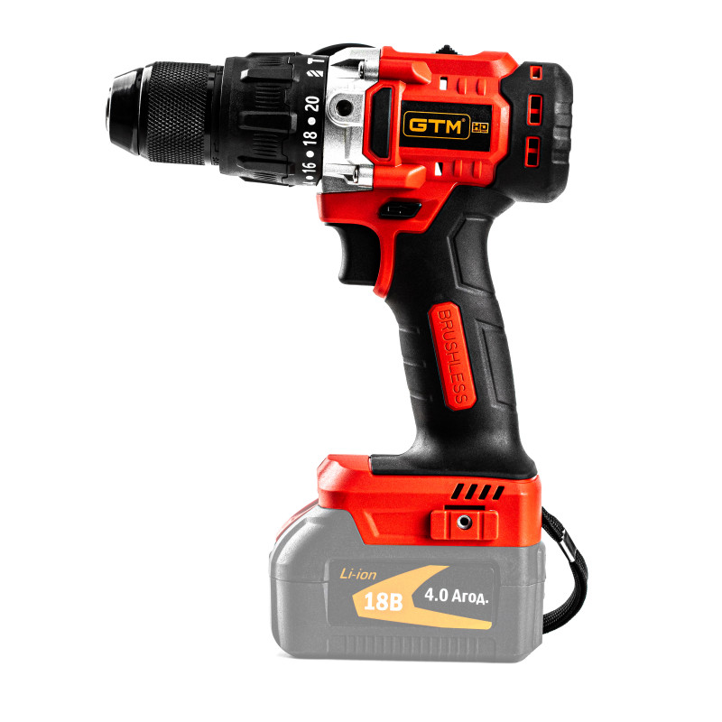 GTM DSI18/80BL - безщітковий дриль-шурупокрут професійного класу з живленням від Li-Ion акумуляторів напругою 18 В. У шурупокруті встановлений повністю металевий швидкозатискний 13 мм патрон для роботи з бітами та свердлами. Редуктор у цій моделі двоступінчастий, що дозволяє регулювати максимальну швидкість залежно від завдання. У даній моделі є 20 режимів для закручування кріплень, з максимальним крутним моментом 80 Н*м, а також є режим свердління і свердління з ударом.