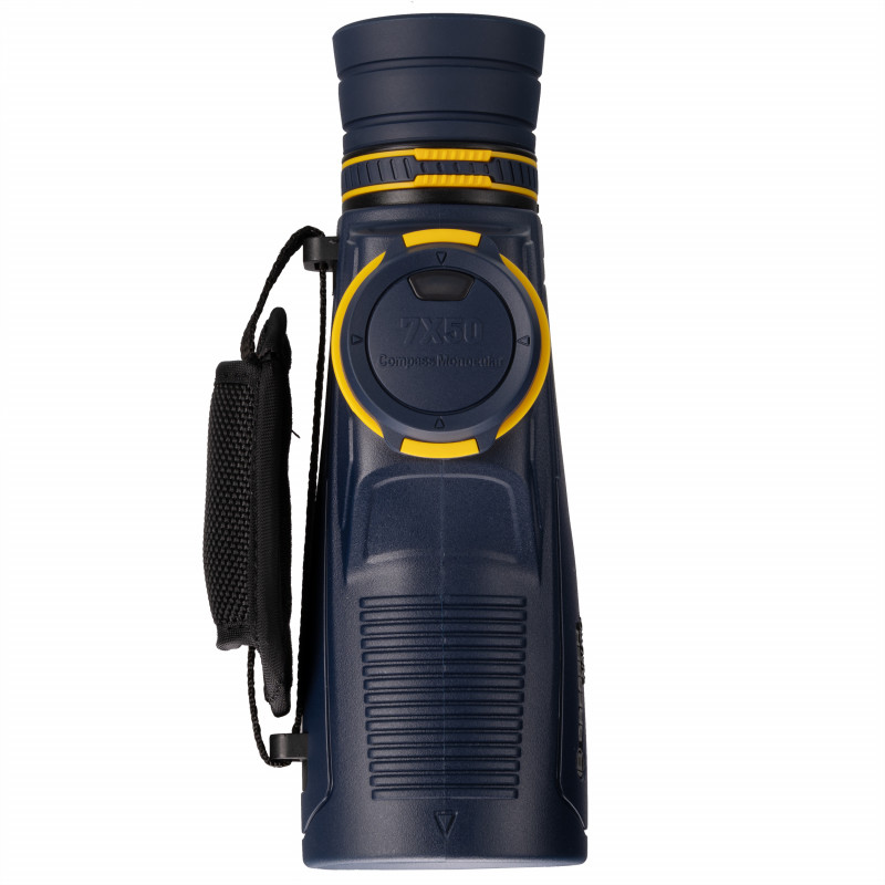 - Вбудований компас — монокуляр оснащений інтегрованим компасом, що відображається безпосередньо в полі зору спостерігача. Це дозволяє одночасно вести спостереження та визначати напрямок без необхідності відриватися від окуляра. Компас є незамінним інструментом для навігації під час морських походів, парусного спорту та орієнтування на місцевості. Наявність компаса підвищує безпеку та оперативність прийняття навігаційних рішень.