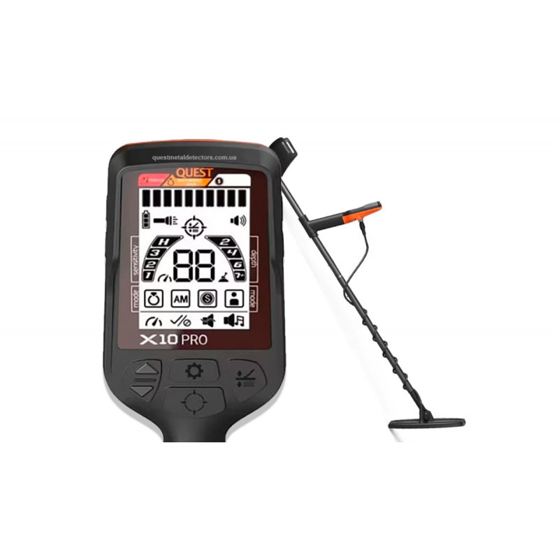 Quest X10 Pro працює на частоті 12 кГц і підтримує чотири пошукові програми, що дозволяє вибрати оптимальний режим для кожного типу пошуку. Металошукач оснащений графічною шкалою дискримінації металів на 10 сегментів, глибинометром із 4 сегментами та функцією балансу ґрунту. Дисплей має підсвічування, яке можна відключити, а робочу область освітлює вбудований світлодіодний ліхтарик. Пристрій також підтримує регульовану гучність і має роз’єм для навушників (3,5 мм).