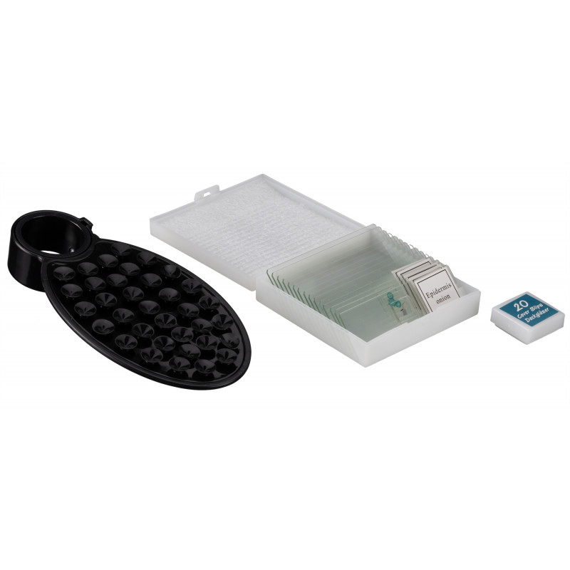 Мікроскоп поставляється в персональному пластиковому кейсі. Прилад та всі аксесуари розміщені у ложементах, вирізаних у пінополіуретановій основі. Для легкого старту спостережень у комплекті з мікроскопом поставляється набір готових слайдів, предметного та покривного скла.