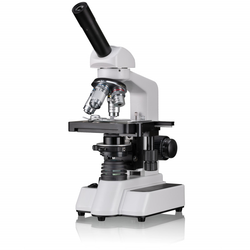 - Чотири ступені збільшення (40x, 100x, 400x, 1000x) — мікроскоп оснащений чотирма об'єктивами: 4x, 10x, 40x та 100x, які у поєднанні з окуляром 10x дають чотири рівні збільшення. Це дозволяє переходити від загального огляду препарату до вивчення найдрібніших клітинних структур. Такий діапазон є оптимальним для навчальних і аматорських досліджень у біології та ботаніці.