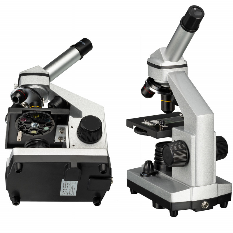 Мікроскоп Bresser Junior Biolux CA 40x -1024x з адаптером для смартфона + кейс (8855002) добре укомплектована модель мікроскопа, з пластиковим кейсом, широким набором аксесуарів, а також адаптером для планшета або сматфону, який забезпечить зйомку результатів спостережень. Таким чином, мікроскоп безумовно буде цікавий і дітям і підліткам. Дана модель поставляється з широким набором аксесуарів, об'єктивів і окулярів, необхідних для старту спостережень, що дає можливість відразу зануритися в цікавий і захоплюючий мікросвіт. Зручний та легкий пластиковий кейс призначений для зберігання та транспортування мікроскопа та аксесуарів та приладдя. Комбінація двох ширококутних окулярів та трьох об'єктивів дає можливість отримати збільшення 640х. Досить корисним та цікавим є використання у підлітковому мікроскопі лінзи Барлоу для отримання безступінчастого (плавного) зумування зображення, завдяки чому досягається максимальне збільшення 1024х. Монокулярна насадка, нахилена під кутом 45°, повертається на 360°, дозволяючи спостерігати у будь-якому зручному положенні, і навіть працювати з мікроскопом групі дітей чи дорослих без переміщення мікроскопа у просторі. Світлодіоди забезпечують підсвічування препарату світлом, що проходить наскрізь і відбитим. Світло, що проходить, використовується для спостереження прозорих об'єктів, що відображає – для непрозорих тривимірних. Використання двох ламп одночасно може бути корисним при спостереженні напівпрозорих зразків. Передача кольору і інтенсивність пучка світла контролюється діафрагмою з різними діаметрами отворів і п'ятьма світлофільтрами. У комплектацію входить адаптер для смартфона (планшета). Адаптер кріпиться на тубусі мікроскопа і дозволяє проводити фото і відеозйомку головною або передньою камерою гаджета. Гладка тильна сторона смартфона надійно кріпиться за допомогою безлічі присосок адаптера (у разі рифленої тильної поверхні смартфона рекомендується використовувати передню камеру). Живлення мікроскопа здійснюється від трьох найпоширеніших батарей АА (LR6). Таким чином, мікроскоп незалежний від мережі змінного струму і може бути використаний навіть у польових умовах. Перелік аксесуарів включає готові слайди, до огляду яких можна розпочати негайно. Також у наборі є аксесуари для препарування зразків, мікротоми для самостійного приготування зразків, інкубаторій та препарати для самостійного приготування. Незважаючи на те, що даний прилад швидше буде цікавим для дітей та підлітків, всі оптичні елементи виконані зі скла, серйозне збільшення дозволить розглянути більшість з того, що доступне "дорослому" біологічному мікроскопу.