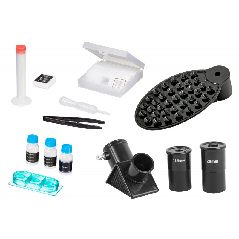 | Комплектація | Телескоп Тринога з монтуванням Окуляри телескопа: 2 шт. (20мм, 12.5мм) Діагональне дзеркало Мікроскоп Об'єктив мікроскопа: 3 шт. Зум-окуляр мікроскопа: 1 шт. Адаптер для камери смартфона (планшета): 1 шт. Інкубаторій: 1 шт. Слайди підготовлені: 3 шт. Предметне скло: 9 шт. Покривне скло: 10 шт. Набір аксесуарів для препарування Баночка з дріжджами: 1 шт. Баночки для зразків: 5 шт. |