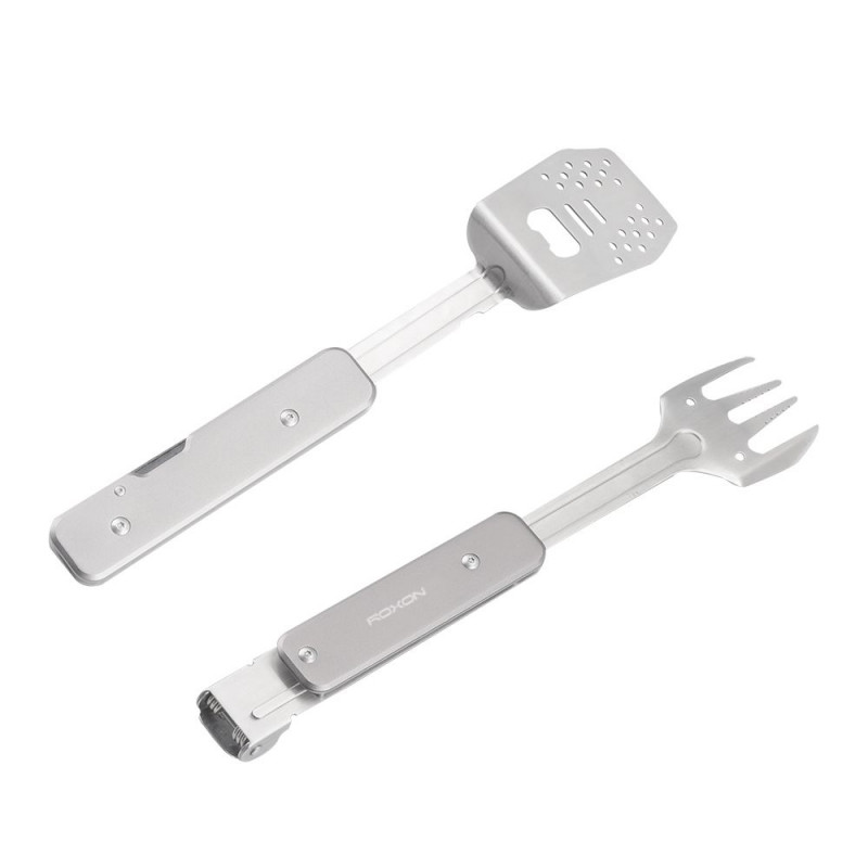 Модель S602 від бренду Roxon – це компактна версія мультитула для приготування барбекю. Він складається з металевих лопатки та виделки, які можуть використовуватися як самостійні інструменти, а разом утворюють зручні щипці. Крім того, в лопатку вбудована відкривачка для пляшок.