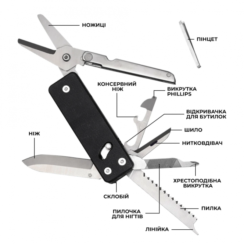 Функціонал розширюють пінцет і склобій із заокругленим дизайном для запобігання появі зачіпок на тканині під час носіння в кишені. Твердість склобою сягає 90 HRC.