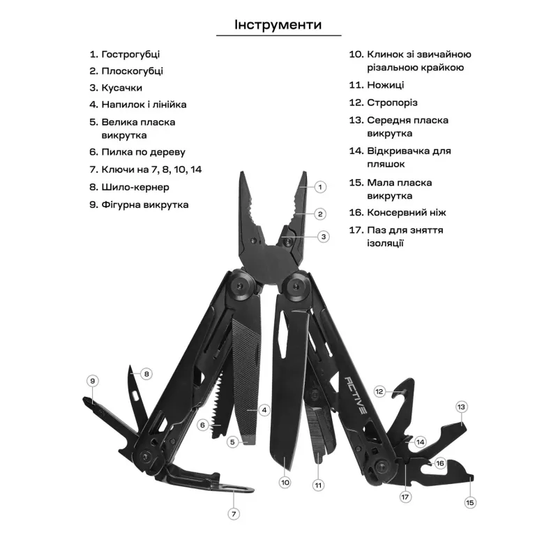 Active Batman – це багатофункціональний інструмент, що стане у нагоді, як у повсякденному житті, так і під час відпочинку або туризму. Серед основних переваг мультитулу Active Batman можна відзначити підпружинені плоскогубці, клинок з нержавіючої сталі розміром 78 мм, а також наявність кишенькової кліпси. Мультитул та всі його інструменти мають чорне антиблікове покриття. Active Batman комплектується нейлоновим чохлом.