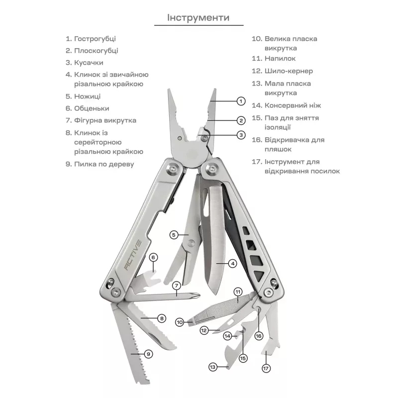 - Консервний ніж + відкривачка для пляшок + паз для зняття ізоляції;