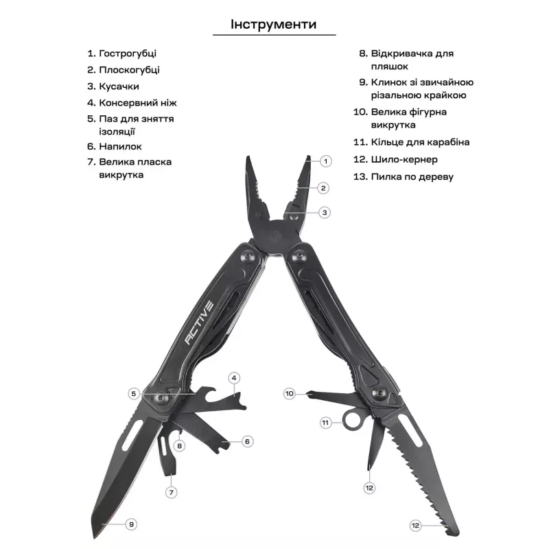 Мультитули бренду Active Knives&Tools - це сучасні, універсальні інструменти, головною відмінністю яких, є співвідношення ціни-якості в порівнянні з мультитулами інших брендів. Мультитули ідеально справляються з поставленими завданнями завдяки інструментам з високоякісної нержавіючої сталі. Ергономічні руків’я відмінно лежать в руці та забезпечують надійний хват. Це незамінні супутники як у повсякденному житті, так і під час відпочинку чи туризму.