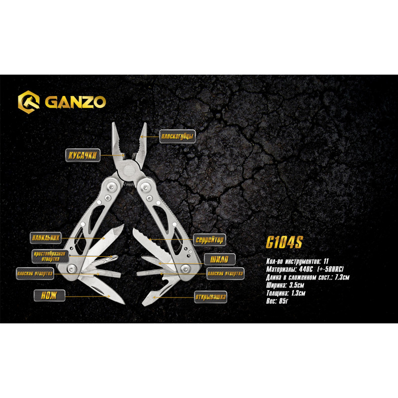 Новинка від компанії Ganzo – складаний мультитул G104 S. Модель G104 S відрізняється компактними розмірами і невеликою масою. Оптимальний набір інструментів дозволяє виконати більшість робіт, які можуть знадобитися в міських умовах. В комплект мультитула G104 S входять наступні інструменти: підпружинені плоскогубці з кусачками, два леза, одне з яких має серейторне заточування, дві плоских і одна хрестоподібна викрутка середнього розміру, шило, невеликий напилок, паз для зняття ізоляції з проводів, відкривачка для пляшок і консервний ніж. Всі інструменти виготовлені з високоякісної сталі 440С, яка має високі експлуатаційні характеристики.