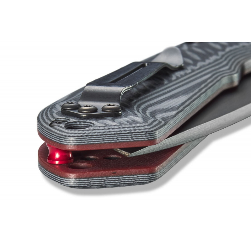 Benchmade замінив бюджетний варіант Versaflex на G10 для виробництва ручки. І не просто G10: багатошаровий G10 з сірим і чорним шарами, з товстою інтегрованої червоною підкладкою. Це додає трохи ваги, але також гарантує, що Benchmade Super Freek буде відчувати себе трохи більш міцним.