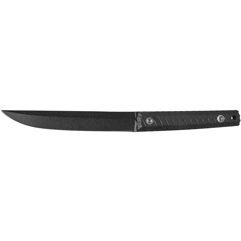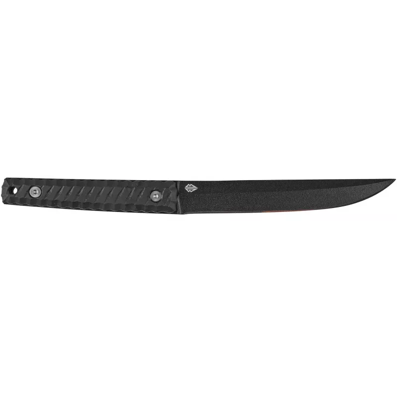 Клинок виготовлений з німецької нержавіючої сталі марки 1.4116, товщиною 5 мм. Дана марка сталі гартується до твердості 57 HRC та легко правиться в польових умовах без спеціального інструменту. Клинок має увігнуті спуски, плейновий тип різальної кромки та чорне, полімерне антиблікове покриття.