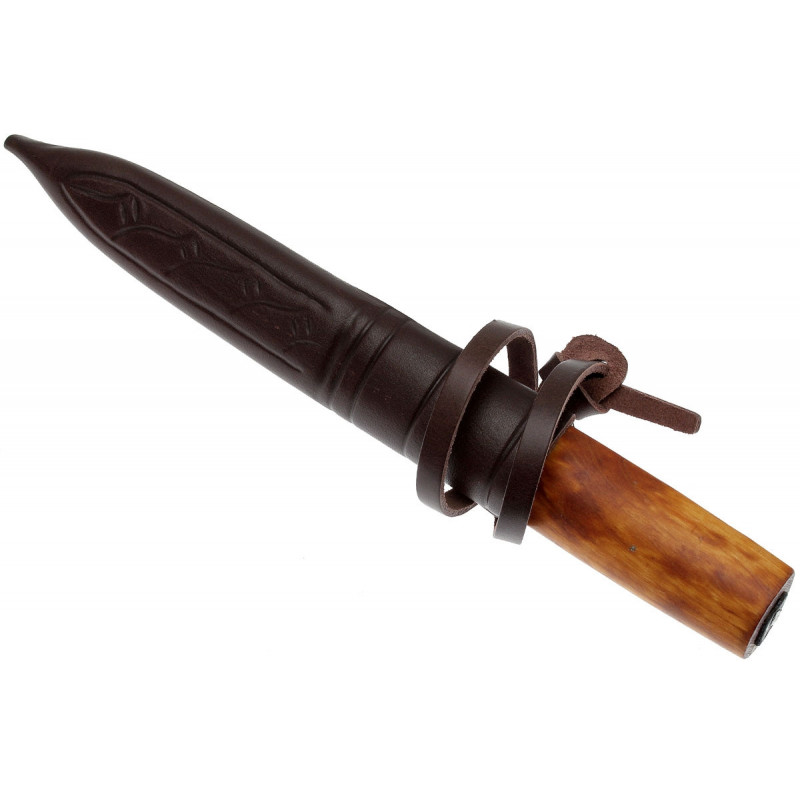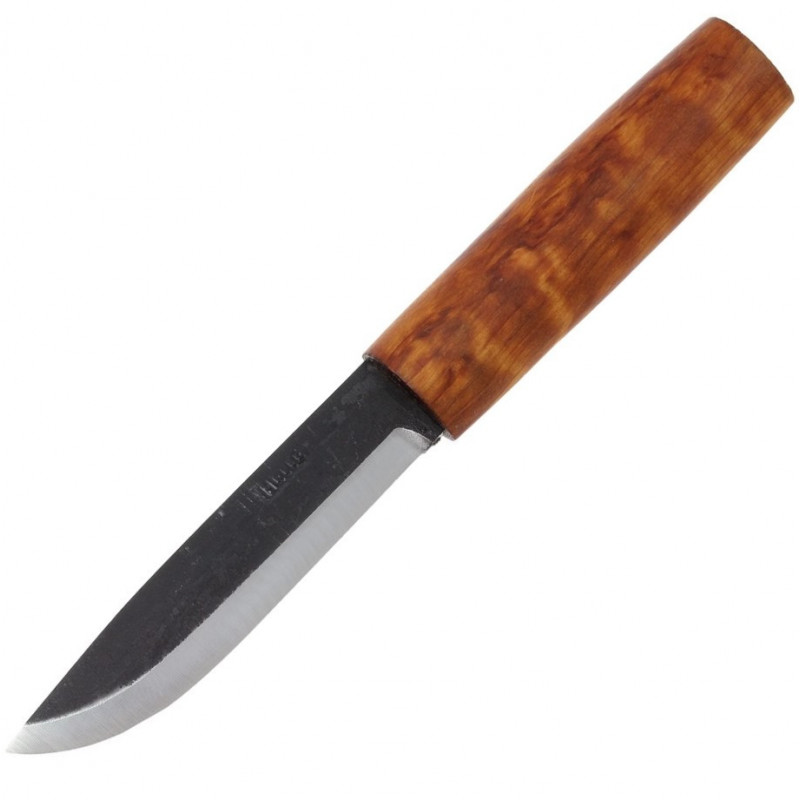 Клинок ножа, в отличии от остальных моделей, изготовлен из трехслойной углеродистой стали, обеспечивающий крайне эффективные показатели реза. Рукоятка из древесины карельской березы имеет форму, обеспечивающую комфорт при любом способе удержания.