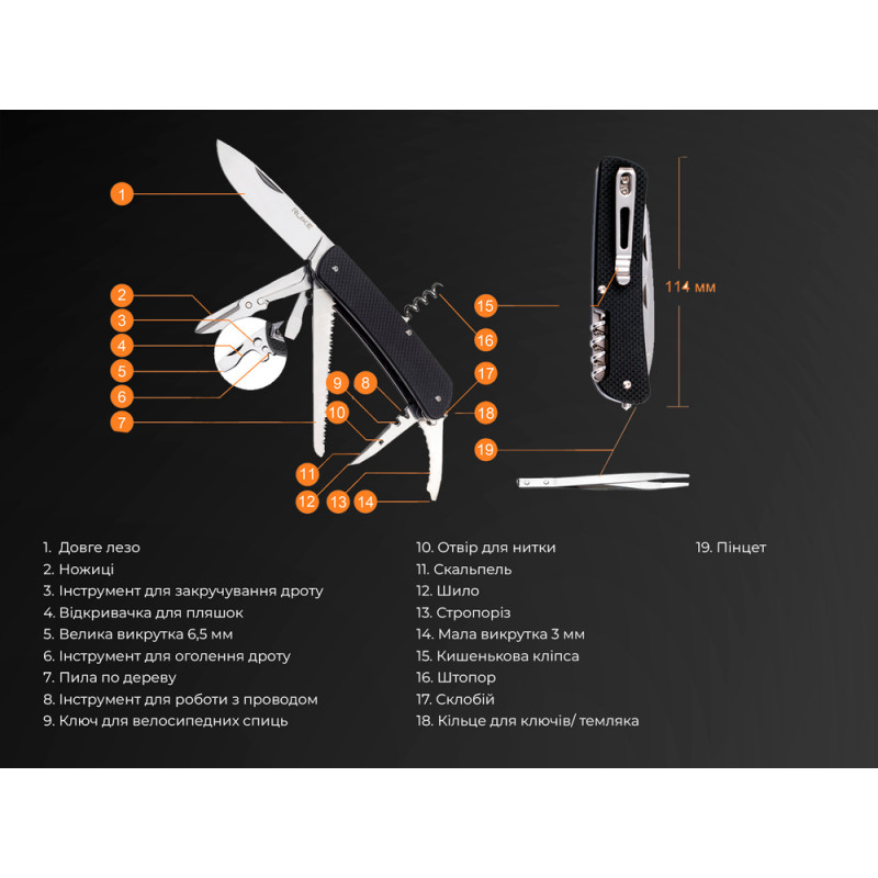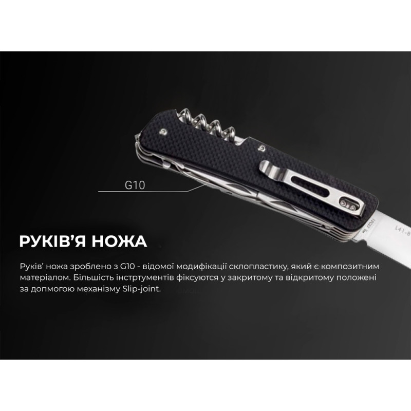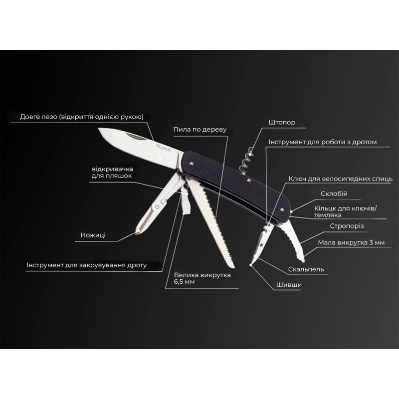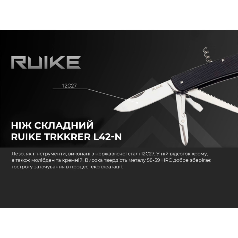 Не менш важливу функцію ніж ніж, грають і інші інструменти, вбудовані в Ruike L42. У нижній частині рукоятки розміщені пила по дереву, зменшені в розмірі ножиці, шило, дві прямі викрутки (мала і середня), стропоріз, відкривачку для пляшок, інструмент, зачищающий дроти від ізоляції. Із зворотного боку рукоятки можна дістати штопор. Ще два інструменту поміщені зі сторони торця – це склобій і невеликий кільце для підвішування до ножа темляка.