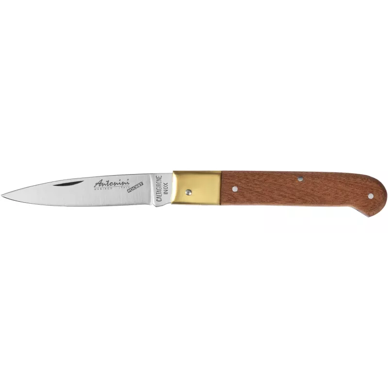 Antonini Pocket Caltagirone названа на честь села Кальтаджіроне на Сицилії і є грубішою, більш робочою версією моделі Siciliano. Клинок ножа виконаний з нержавіючої сталі 420, що відкривається обома руками та немає фіксувального замка. Таке конструктивне рішення дозволить сміливо використовувати ніж майже по всьому світу. Злегка вигнуте на кінці руків’я виконане з дерева Котібе - це екзотична порода дерева, що походить із Західної та Центральної Африки. Больстер виготовлений з латуні.