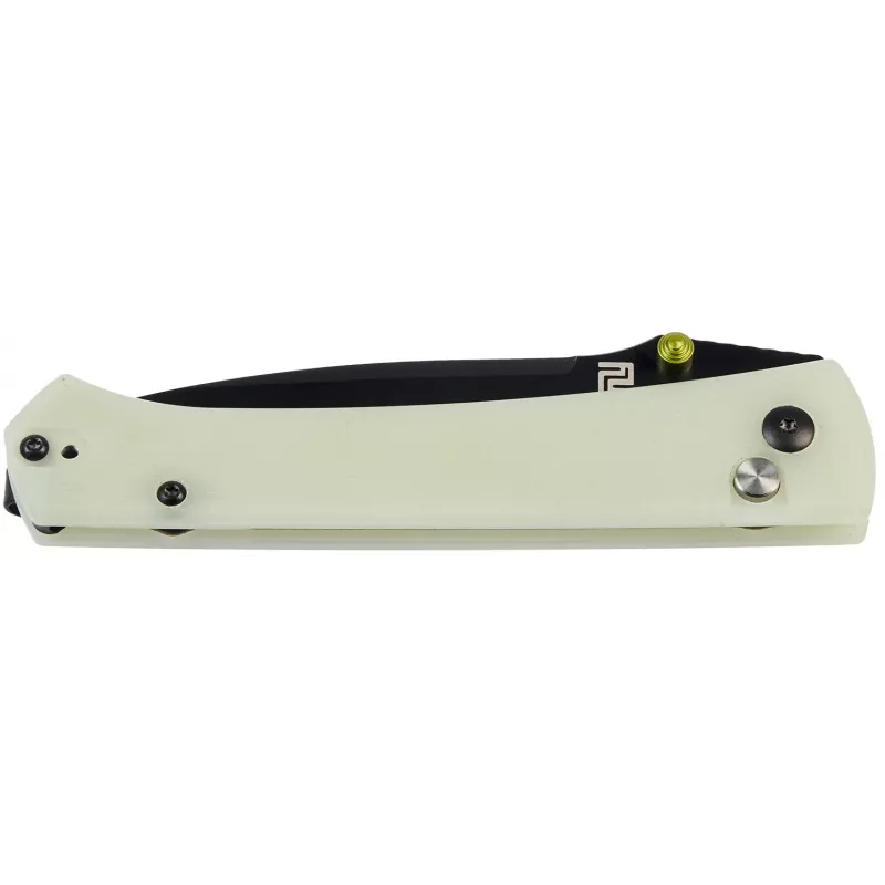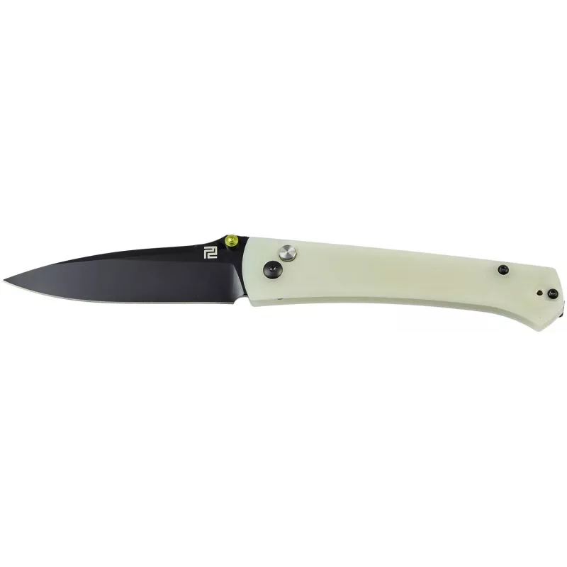 Нова лінійка складаних ножів від Artisan отримала чудову назву Андромеда і цілком відповідає їй. Витончений клинок профілю Drop point виготовлений із фірмової порошкової сталі компанії - AR-RPM9 (Artisan-Rare Powdered Material 9 Element Steel). Ексклюзивна сталь має однорідну структуру, яка дозволяє зберігати гостру різальну кромку протягом тривалого періоду, проста в правці і відмінно витримує навантаження. На обух клинка нанесено низку дрібних насічок для упору великим пальцем. Фінішна обробка клинка може відрізнятися залежно від моделі. Це може бути, як і маскуюча дрібні подряпини, матова обробка Stonewash, так і чорне PVD (Physical Vapor Deposition) покриття, яке захищає сталь клинка від вологи, агресивних хімічних речовин і корозії. Відкриття клинка відбувається за рахунок шпеника, а фіксується у відкритому положенні замком Button Lock. Легкий, але водночас міцний склотекстоліт G10 послужив для виготовлення накладок чорного і оливкового кольору. Для зручнішого носіння передбачена кишенькова кліпса.
