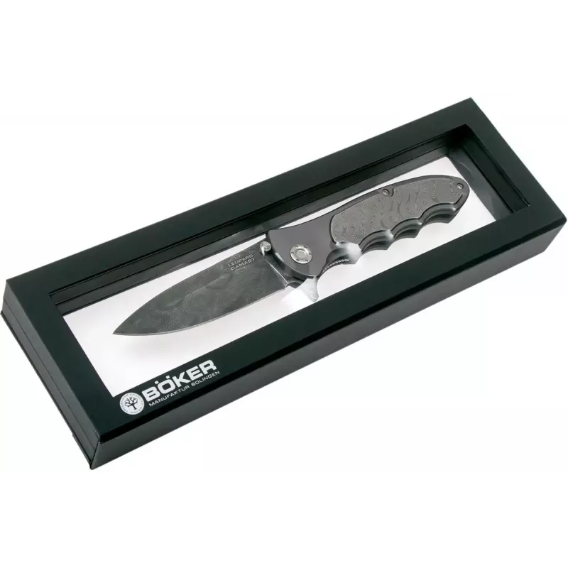 Ще один колекційний ніж від Boker -- Leopard-Damascus III Collection. У цій моделі 300-шарова дамаська сталь зі ствола гармати танка Leopard доповнено інкрустацією на рукояті - теж з дамаска, тільки в 180 шарів. Щоб відкрити ніж, можна скористатися як фліпером, так і двостороннім шпеником.