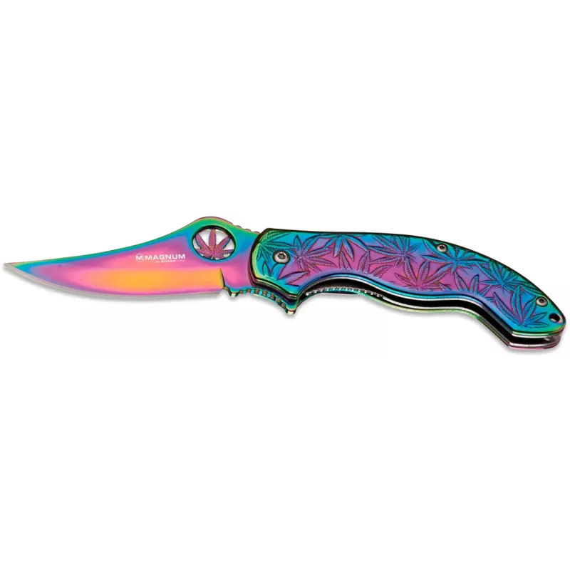 Зручний складаний ніж серії Rainbow з покриттям, що переливається всіма кольорами веселки. Colorado Rainbow легко приводиться в робоче положення однією рукою. Міцна, виконана з нержавіючої сталі рукоять прикрашена візерунками у вигляді листя конопель. Сталевий клинок фіксується у відкритому положенні за допомогою механізму лайнерлок.