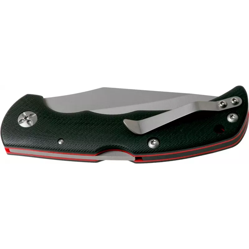 Руків’я має ергономічний форм-фактор і покрита текстурними накладками з G-10, а також з інтегрованим пластиковим бекспейсером в тильній частині. Така форма руків’я прекрасно фіксується під час роботи будь-яким хватом. На руків’ї передбачена одностороння кліпса для носіння ножа в положенні tip-up і отвір під темляк.