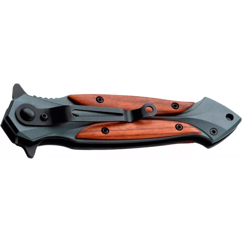 Складаний ніж Boker Magnum Starfighter виконаний у вигляді кинджала. Клинок з нержавіючої сталі 440 має чорне антикорозійне покриття і чудово гармонує з дерев’яними накладками рукояті. Ніж приводиться в робоче положення за допомогою фліпера, який також виконує роль гарди і запобігає зісковзуванню пальців руки на клинок.