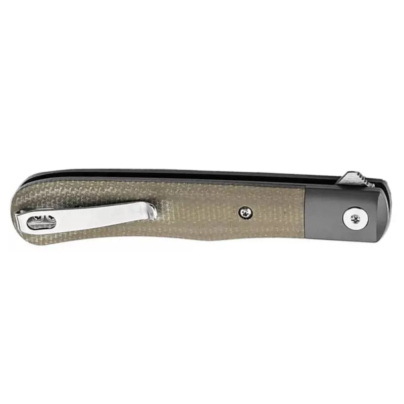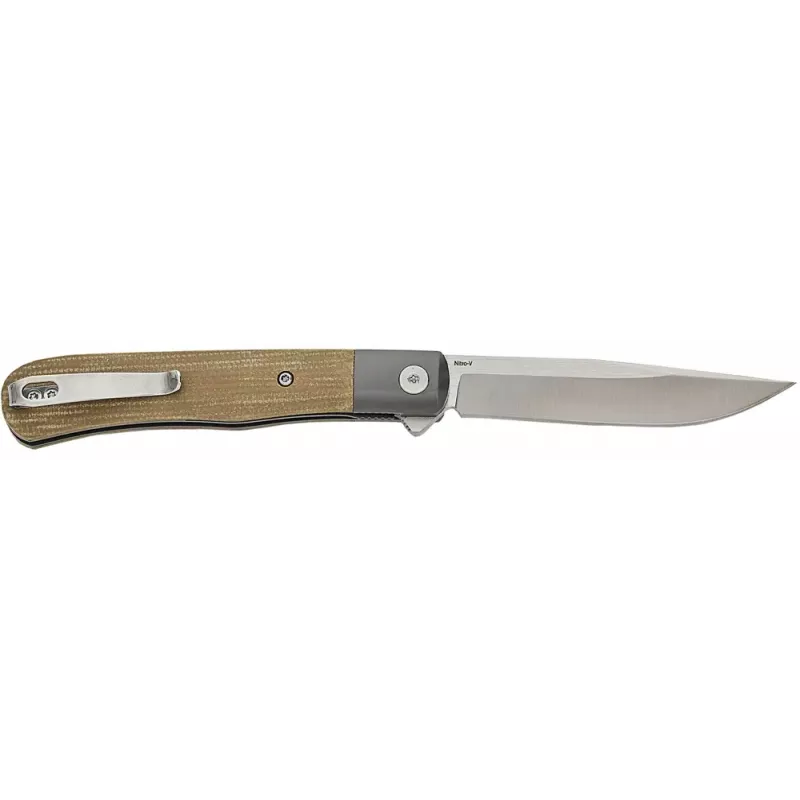 Дизайн ножа виділяється тонкими лініями та стриманістю. Двоскладове руків’я складається з больстера з титановим покриттям та накладками із приємної на дотик мікарти. Клинок Drop point зроблений з міцної та зносостійкої сталі Nitro-V. Інструмент відкривається за допомогою фліпера, у ролі фіксуючого механізму виступає популярний та надійний замок Liner Lock. Система шарикопідшипників гарантує легке та м’яке відкриття ножа. Додатково присутня кліпса для зручного носіння.
