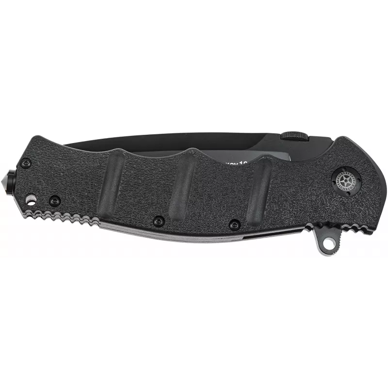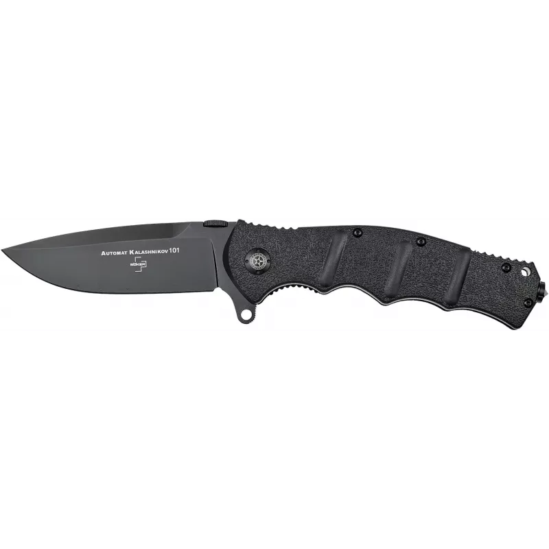 АК101 – потужний ніж з клинком 10 см, добре підійде для полювання, походів і будь-яких екстремальних ситуацій. Рукоять ножа завдяки своїй формі, текстурі і наявності упору для великого пальця з насічкою забезпечує впевнене і комфортне утримання ножа в будь-яких умовах. Під накладками конструкція рукояті посилена за рахунок сталевих пластин товщиною 1,5 мм. Виступ на початку клинка, фліпер, дозволяє швидко відкрити ніж, а після відкриття - грає роль гарди для захисту пальців. Крім фліпера клинок можна акуратно відкрити пальцем (навіть в рукавичці) за допомогою спеціального упору – диска на обуху клинка. Клинок, зроблений зі сталі 440С або D2, його вигнута форма з невеликим «черевом» дозволяє комфортно різати різні матеріали. Для екстрених ситуацій в рукояті ножа встановлений склобій. Замок ножа – «лайнер-лок», кліпса дозволяє носити ніж в кишені у положенні вістрям клинка вверх.
