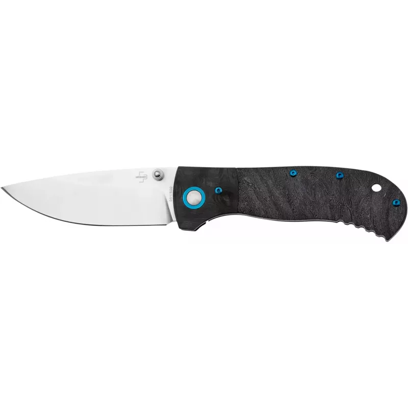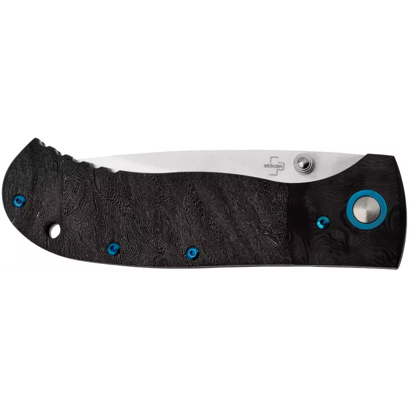 Найвизначнішою родзинкою даного ножа є його двокомпонентна накладка руків’я. Передня частина накладки виконана з матеріалу FAT Carbon та має неповторний візерунок «Чорні дюни», в той час, як задня частина виготовлена з вуглецевого волокна та має неперевершену текстуру «Космічний корал». Осьове кільце та гвинти, виготовлені з титану з анодуванням синього кольору, додають яскравих акцентів та гармонійно доповнюють дизайн. Boker Plus Collection 2024 оснащений стильною кишеньковою кліпсою, яка виточена з суцільного шматка титану. На торці руків’я розташований отвір під темляк чи ремінець.