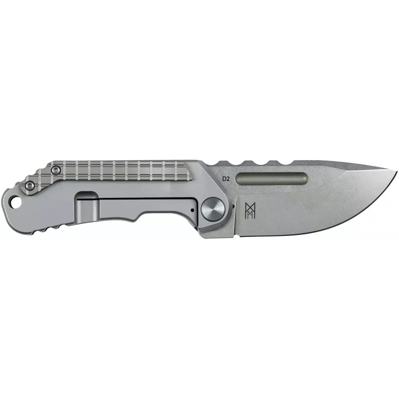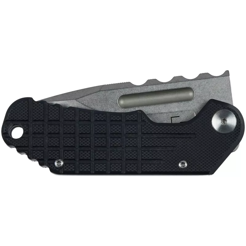 Короткий, проте масивний клинок має профіль Drop Point або American Tanto, залежно від моделі, та виготовлений зі сталі D2. Покриття Stonewash надійно захищає від подряпин та приховує сліди експлуатації. Відкривається за допомогою підпальцевої виїмки та надійно фіксується замком Frame Lock. Насічки на обуху клинка гарантують надійний упор для великого пальця при виконанні силових різальних задач.