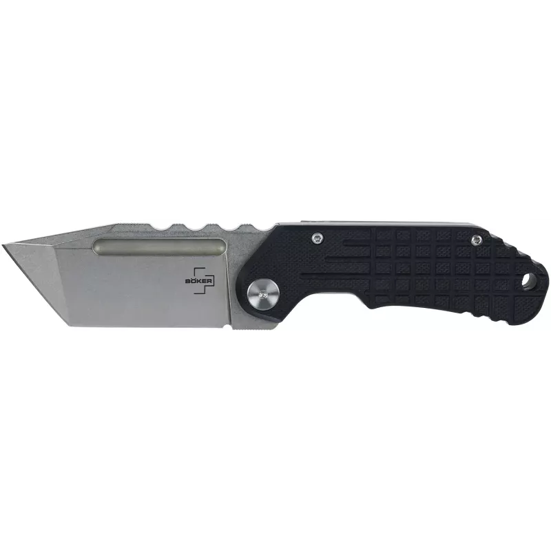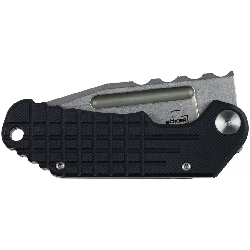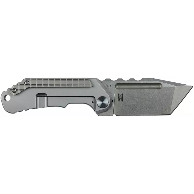 Короткий, проте масивний клинок має профіль Drop Point або American Tanto, залежно від моделі, та виготовлений зі сталі D2. Покриття Stonewash надійно захищає від подряпин та приховує сліди експлуатації. Відкривається за допомогою підпальцевої виїмки та надійно фіксується замком Frame Lock. Насічки на обуху клинка гарантують надійний упор для великого пальця при виконанні силових різальних задач.
