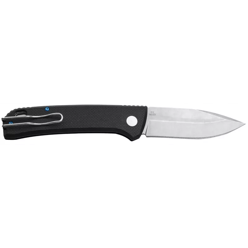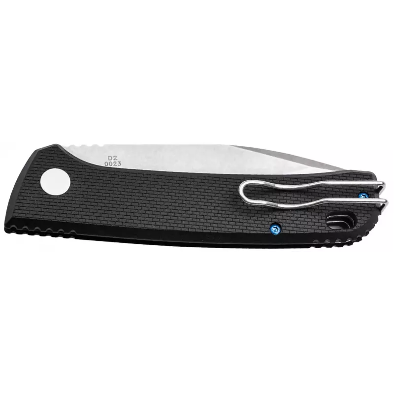 Накладки на руків’ї ножа виготовлено з матеріалу Grivory, має отвір під темляк та має цупку геометричну текстуру, що забезпечує надійний хват навіть вологими руками. Варто звернути увагу на декоративні елементи, такі як анодовані гвинти синього кольору та мінімалістична дротяна кліпса, яка допоможе зручно та непомітно носити ніж в кишені.