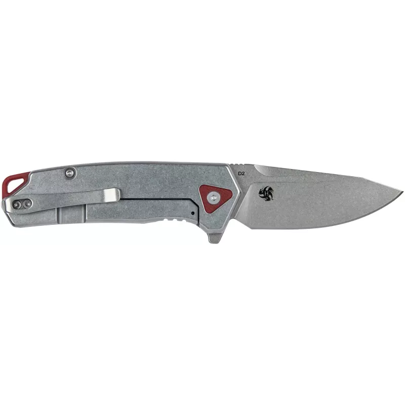 Клинок профілю Drop Point виготовлений зі сталі D2. Надзвичайно легко відкривається за допомогою фліпера та системі шарикопідшипників. У відкритому стані надійно фіксується замком Frame Lock. За захист від подряпин та слідів експлуатації відповідає покриття Stonewash, а стильне фальш-лезо урізноманітнює простий вигляд клинка.