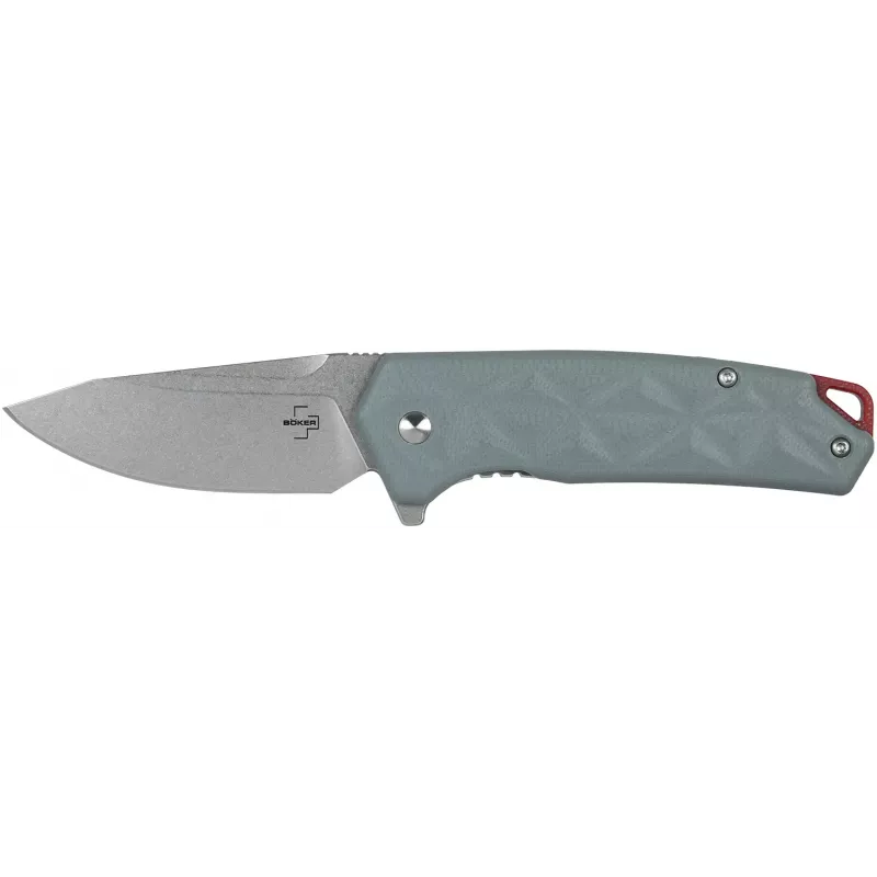 Привабливе руків’я має ергономічну форму та виготовлене з цупкого матеріалу G10. Геометрична текстура підкреслює бачення дизайнера Алессандри де Сантіс та додатково підвищує надійність хвату. Червоний бекспейсер та декоративний трикутник з G10 довершують незвичний вигляд ножа. Ніж оснащений отвором для темляка та кліпсою глибокої посадки для непомітного носіння в кишені штанів. Boker Plus Gemtek поставляється з високоякісним нейлоновим чохлом для безпечного зберігання та носіння.