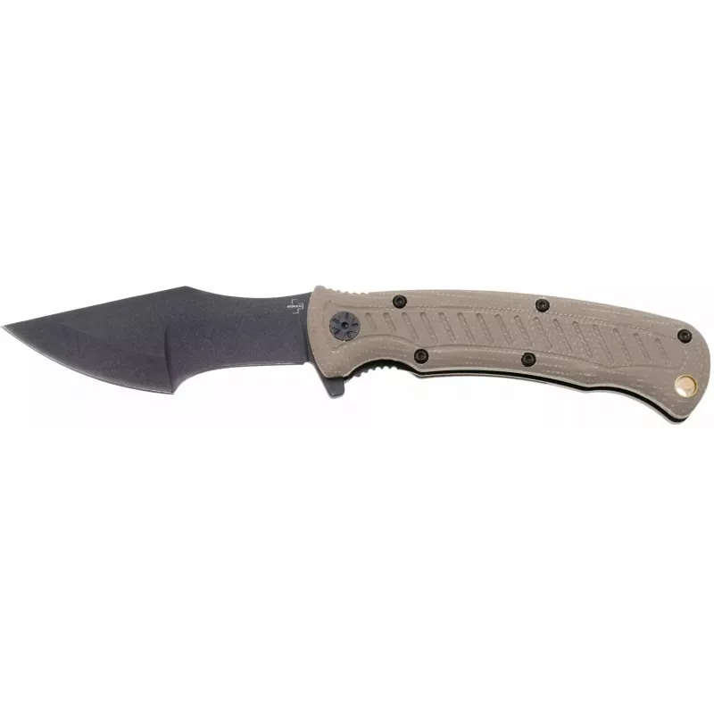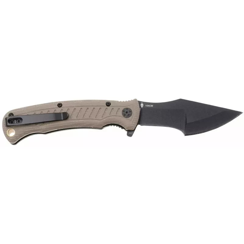 Клинок ножа виконаний зі сталі 154CM та має досить унікальний профіль. Передня частина ідеально підходить для проколу, наприклад, для відкриття ящиків і коробок або проколювання матерії. Задня частина тонша і добре підходить для підготовки паличок для багаття. Клинок приводиться в робоче положення завдяки фліперу та фіксується замком Liner Lock. Накладки руків’я виконані з мікарти. Насічки забезпечують чудовий хват, навіть в умовах підвищеної вологості. На кінці розміщена кліпса та отвір під темляк чи ремінець.
