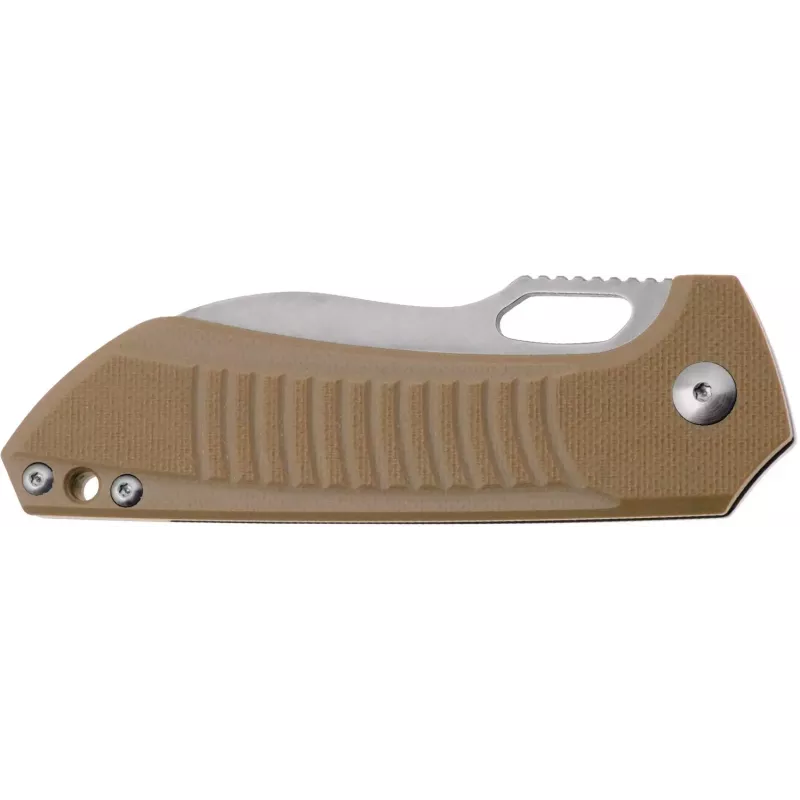Накладки руків’я виготовлені з цупкого матеріалу G10. Текстура руків’я виконує не просто декоративну функцію, а додає міцності хвату, завдяки тактичному досвіду дизайнера. На торці розміщена кишенькова кліпса та отвір для темляка, які посилюють концепцію EDC та забезпечують зручне щоденне носіння.
