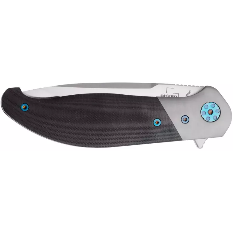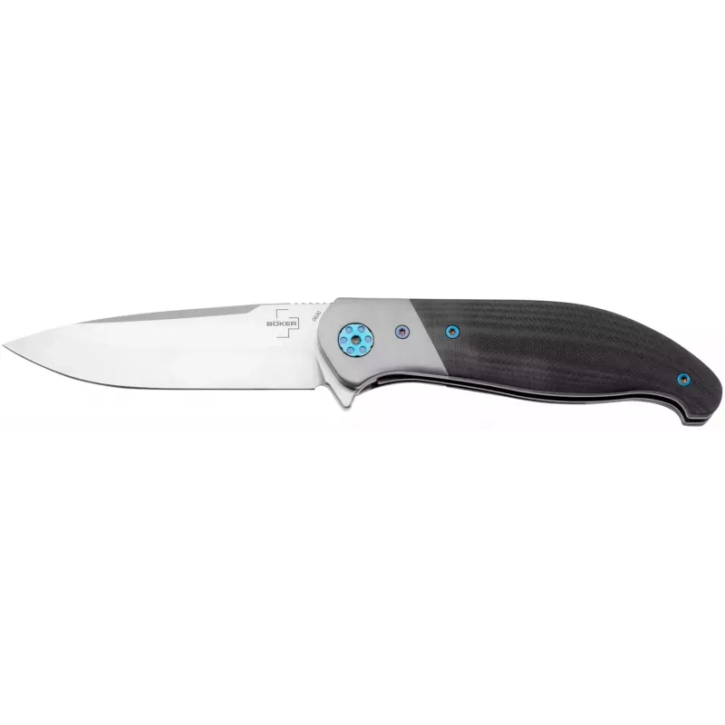 Клинок профілю Drop Point виготовлений з інструментальної сталі D2 та має приємне сатинування. Ніж приводиться в робоче положення завдяки фліперу та надійно фіксується замком Liner Lock. Насічки на обуху надають додатковий упор під час різу, а тому ніж може використовуватись як для щоденних завдань, так і для невеликої роботи в польових умовах. Невелике фальш-лезо розбавляє простий профіль клинка та урізноманітнює дизайн.