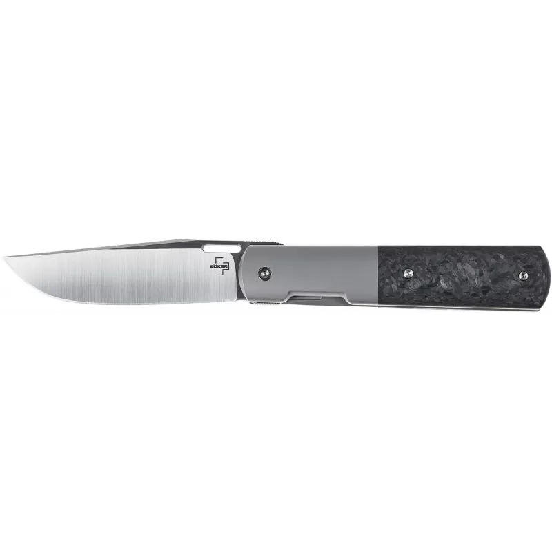 Складаний ніж Boker Plus Urban Barlow - це оригінальна інтерпретація Бреда Зінкера класичної моделі Barlow, прикрашена сучасними елементами. Об’ємний клинок профілю Drop Point виготовлений з міцної порошкової сталі марки M390 з легким сатиновим фінішем. Приводиться в робоче положення за допомогою нігтьової виїмки або закругленого фліпера з насічками. Фіксується в робочому положенні надійним замком Frame Lock. Характерною особливістю Boker Plus Urban Barlow є наддовгий больстер, виготовлений із титану. Друга половина руків’я оснащена накладкою з вуглецевого волокна (карбону), що підкреслює сучасний характер ножа. Широка титанова кліпса, викувана з цільного шматка металу, забезпечує зручний спосіб носіння в кишені.