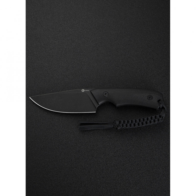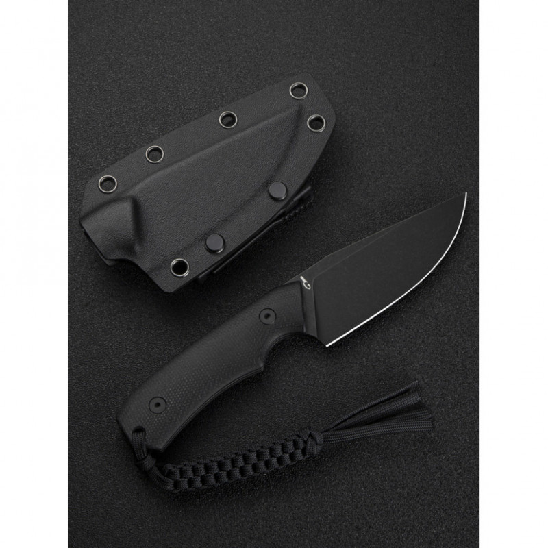 - Клинок з нержавіючої сталі Sandvik 14C28N. Це високоякісна шведська марка з високою корозійною стійкістю та твердістю 58–60 HRC. Метал легкий в обслуговуванні, а обробка методом галтування з чорним покриттям приховує відбитки пальців.