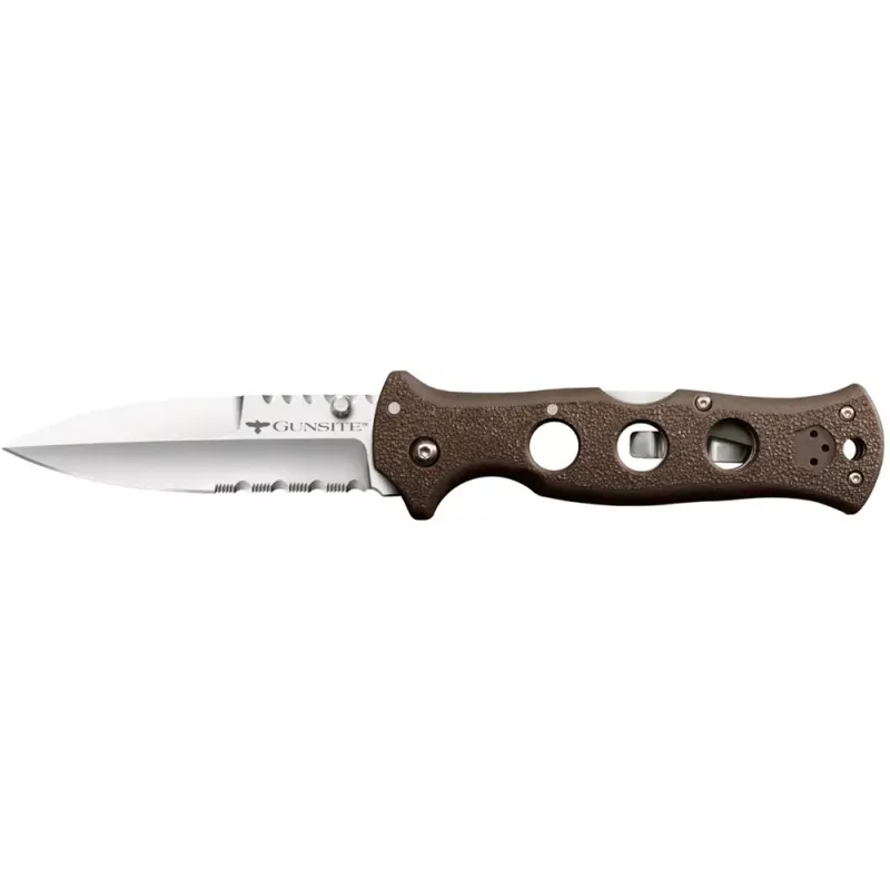 Складаний ніж Gunsite Counter Point відрізняється витонченим дизайном і чудовими різальними якостями. Модель отримала натхненний класичним стилетом клинок профілю Spear Point з напівсерейторною різальною кромкою і яскраво вираженим фальшлезом. Таке поєднання створило ніж, який не тільки чудово виглядає, але й забезпечує приголомшливу продуктивність. Виготовлений з японської сталі AUS10A, клинок Gunsite має високу стійкість до корозії і має гранично гостру різальну кромку. Відкривається ніж за рахунок зручного шпеника, а фіксація в робочому положенні відбувається за рахунок системи замикання Tri-Ad Lock. Ергономічні накладки на руків’ї виготовлені з Griv-Ex і посилені термообробленими алюмінієвими вкладишами, що робить руків’я не тільки дуже міцним, але й зручним практично за будь-якого хвату. На торці розміщений отвір для темляка, а також зручна двостороння кишенькова кліпса.