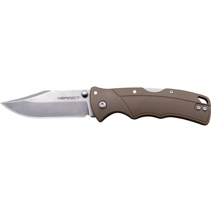 Verdict – це вибір, який дає Cold Steel своїм користувачам та пропонує серію надійних складаних ножів для повсякденного використання. Моделі Verdict оснащені надійною та перевіреною часом системою фіксації клинка Tri-Ad Lock. Приводяться в робоче положення за допомогою зручного шпеника. Для створення клинків послугувала нержавіюча сталь марки 4116, піддана кріогеновому загартуванню, що забезпечує високу твердість і здатність утримувати гостру різальну кромку протягом тривалого періоду часу. Накладки на руків’ї виготовлені із міцного GFN із рифленням для кращої чіпкості. Представлені моделі Verdict у різних колірних варіаціях: чорний, пісочний та оливковий.