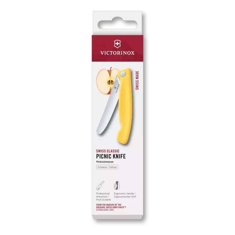 Ніж для пікніка складаний 11см Victorinox Swiss Classic Picnic округлий кінчик, лезо серрейтор, жовтий, картонна коробка (6.7838.FC1))