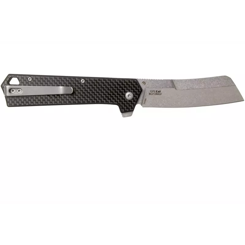 Клинок-тесак виконаний із нержавіючої сталі марки 8Cr13MoV, загартованої до твердості 56-58 HRC, з фінішною обробкою Black Stonewash. Сталь має гарну корозійну стійкість і здатна тривалий час утримувати гостроту ріжучої кромки. Підпружинений клинок витягується за допомогою фліппера та надійно фіксується в робочому положенні за допомогою замка Liner Lock. Швидкий та легкий вихід клинка забезпечується завдяки наявності системи шарикопідшипників.