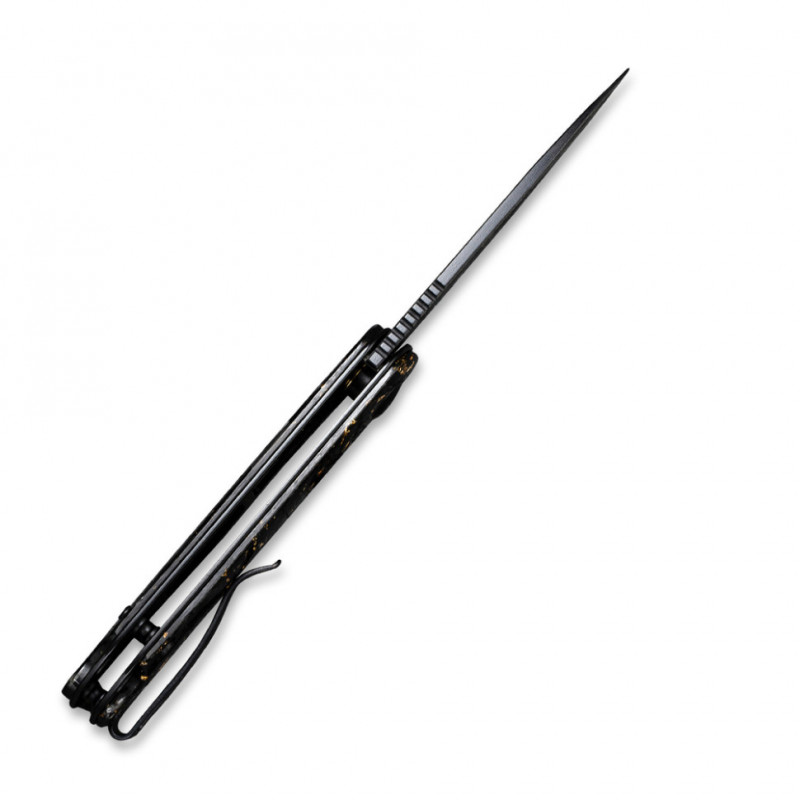З правого боку руківʼя є чорна кліпса зі сталі. Разом з нею складаний ніж важить 77.7 г.